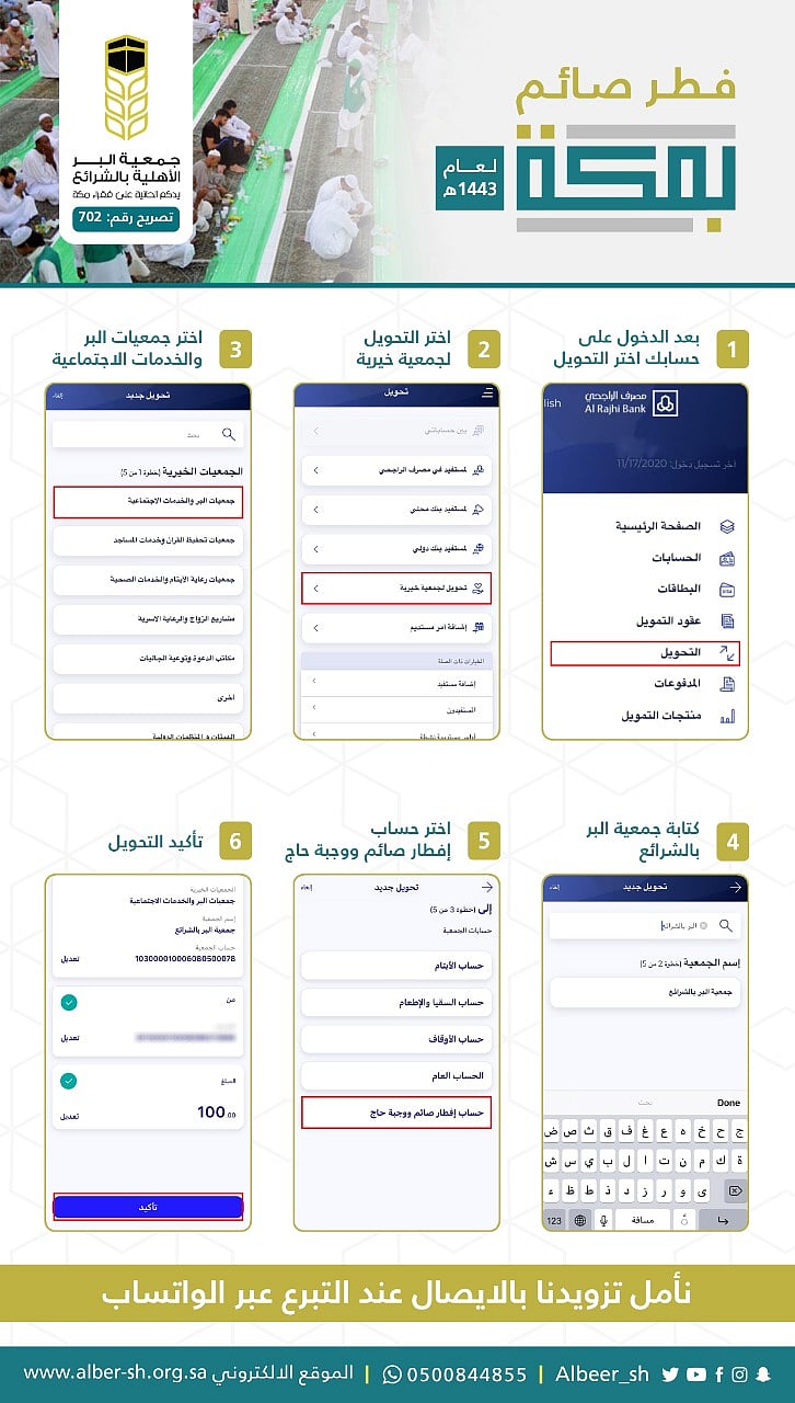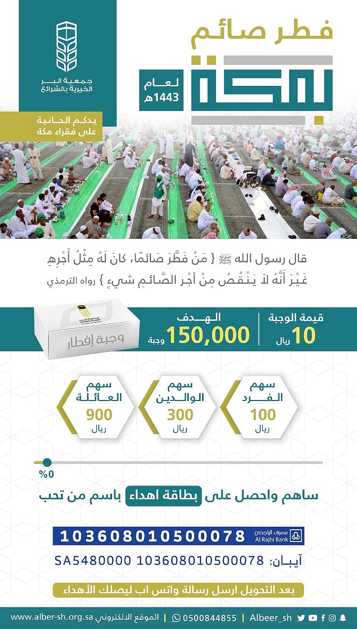 اغتنم شرف المكان والزمان للمساهمة في المشروع: التحويل على الحساب المخصص لمشروع “إفطار صائم” ببنك الراجحي 103608010500078 وللتحويل من بنوك أخرى SA5480000103608010500078 أو عبر المتجر الإلكتروني: https://bit.ly/Eftar1442 وللتواصل مع الجمعية مباشرةً عبر “الواتس أب” http://wa.me/966500844855.