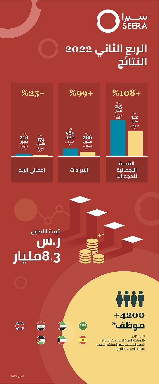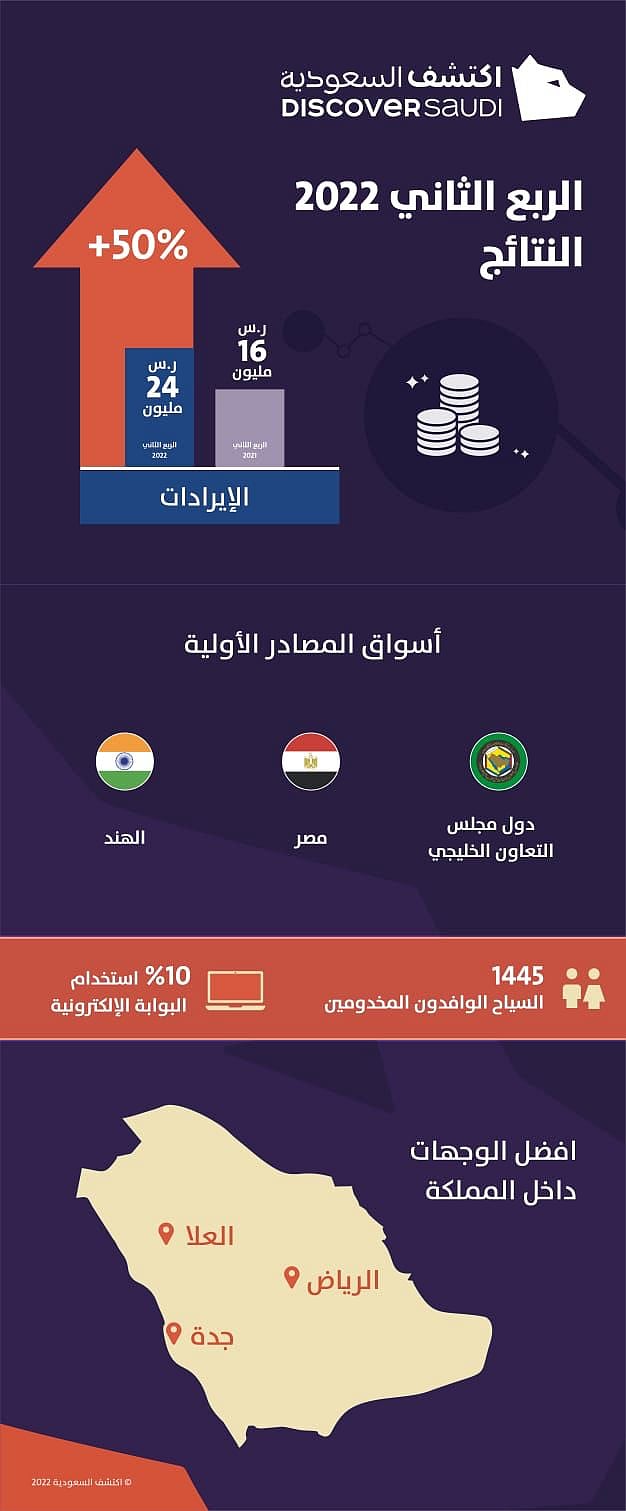 ارتفع النمو في الطلب على الخدمات عبر قطاعات السياحة الداخلية والخارجية والمحلية إلى زيادة القيمة الإجمالية للحجوزات إلى 2.5 مليار ريال سعودي في الربع الثاني (من أبريل إلى يونيو) 2022 بزيادة قدرها 108% مقارنة بـ1.2 مليار ريال سعودي في الربع الثاني من عام 2021.