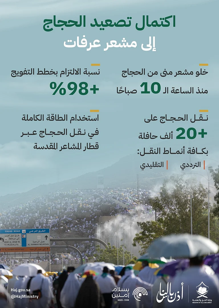 وأوضحت الوزارة أن نسبة الالتزام بالتفويج تجاوزت 98%، وذلك وفقًا للعدد المستهدف من وسائل النقل، وهو 20 ألف حافلة بأنماط النقل كافة وهي الترددي، والتقليدي، بالإضافة إلى استخدام الطاقة الكاملة لنقل الحجاج عبر قطار المشاعر المقدسة.